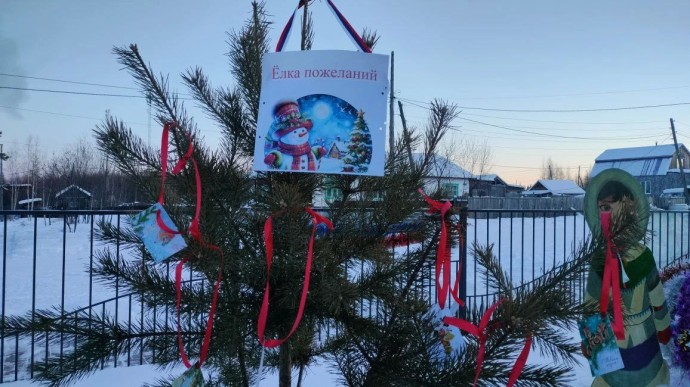Во дворе установили Ёлку пожеланий с пустыми открытками: одни пишут добрые слова, другие «находят» своё, обмениваясь новогодними надеждами и радостью.
