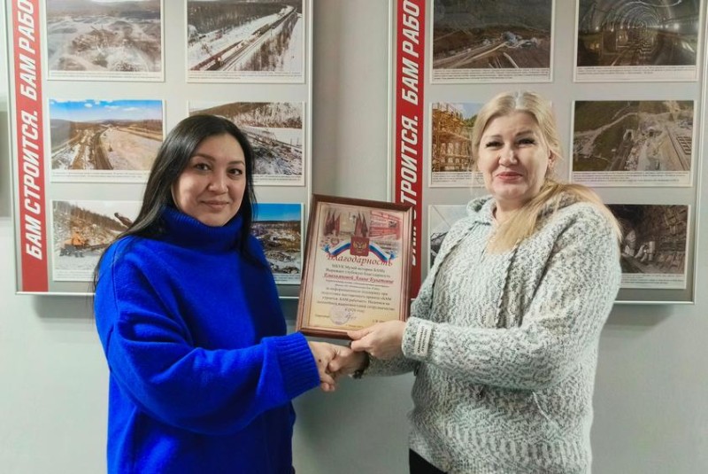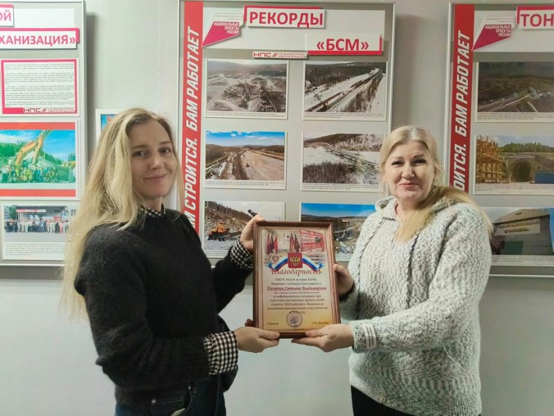 Светлана Другачёва поблагодарила пресс-секретаря компании «Бамстроймеханизация» (входит в Нацпроектстрой) Светлану Назарчук и корреспондента газеты «Дальневосточная магистраль» Алину Емельянову за информационную поддержку при подготовке выставки «БАМ строится. БАМ работает».