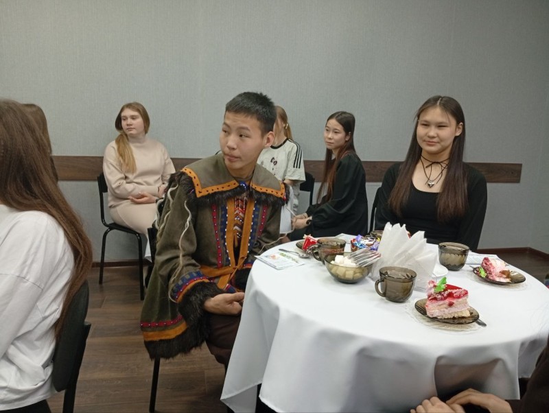 Ребята пообщались с главой Тындинского округа Тамарой Лысаковой в неформальной обстановке. Зал оформили как настоящее кафе со столиками и угощениями.