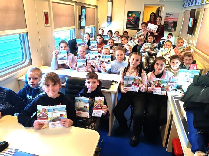 Пригласили ребят в специальный вагон охраны труда и провели занятия в комфортном учебном классе, оснащенном оборудованием для показа презентаций и видеороликов.