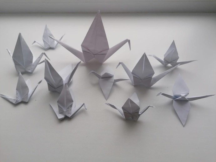 Воспитанники «Художественной студии» сделали фигурки журавлей в технике оригами. История этой игрушки началась еще во время японского средневековья. В то время делать игрушки из бумаги было популярным занятием, одной из самых простых был «цуру», то есть журавлик. В наше время журавлик символизирует борьбу за мир, но в то время он означал долголетие и счастье.