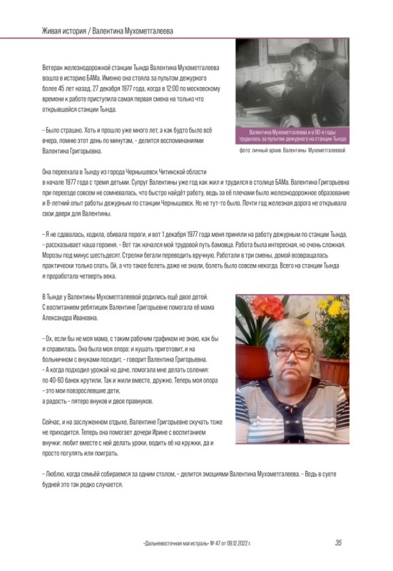Ветеран железнодорожной станции Тында Валентина Мухометгалеева вошла в историю БАМа. Именно она стояла за пультом дежурного более 45 лет назад, 27 декабря 1977 года, когда в 12:00 по московскому времени к работе приступила самая первая смена на только что открывшейся станции Тында.