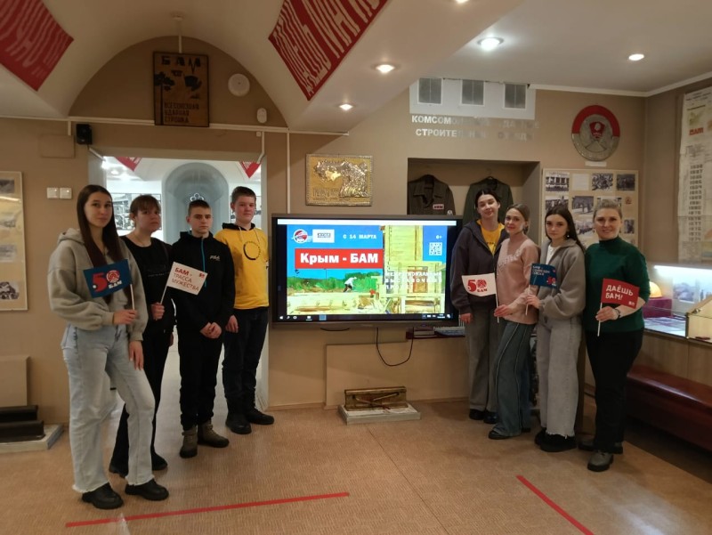 Особое внимание молодёжи было обращено к мультимедийной выставке «Крым – БАМ» — межрегиональному проекту музея истории БАМа и музея истории города Симферополя. Скоро вся наша страна отметит 11-ю годовщину воссоединения Крыма с Россией.