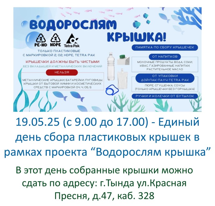 В рамках проекта «Водорослям крышка» администрацией Тындинского округа объявлен Единый день сбора пластиковых крышек