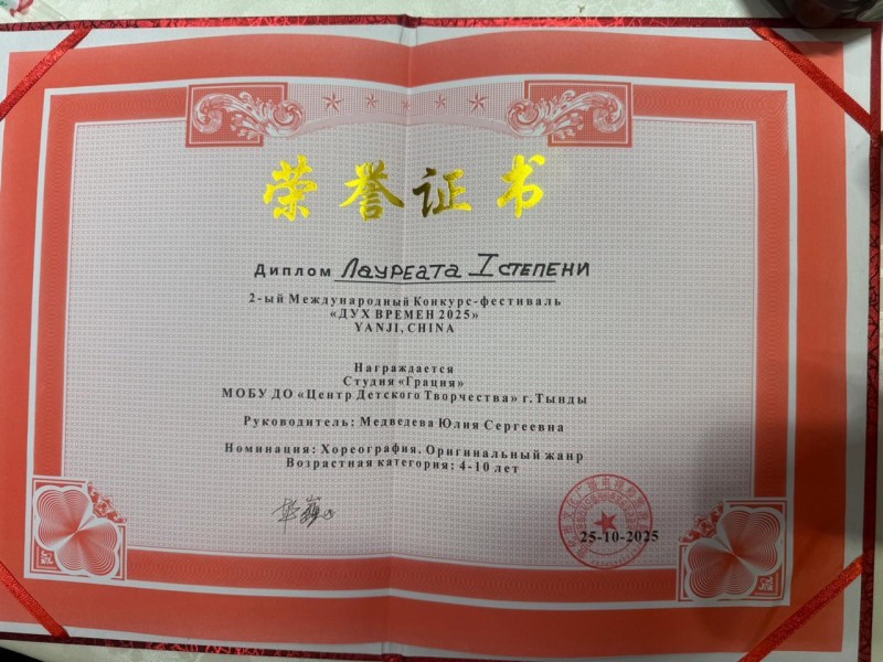 Студия «Грация» Центра детского творчества — победитель 2 Международного конкурса-фестиваля «Дух времен 2025», который проходил в г. Яндзы (Китайская Народная Республика)!