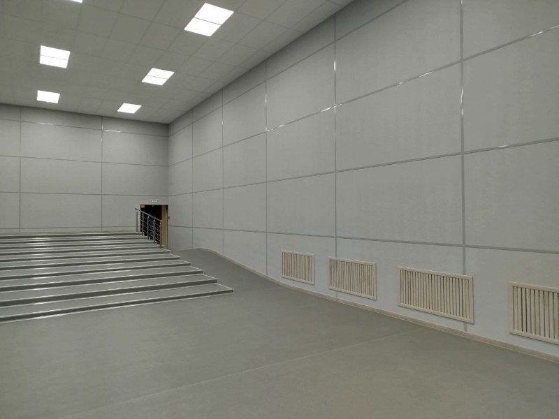 Теперь помещение полностью обновилось и преобразилось. Заменили полы, отремонтировали стены и сцену. Также отремонтировали систему отопления, заменили электрооборудование и электропроводку. Новый потолок с современным освещением добавил залу яркости, а стены теперь выглядят стильно благодаря декоративным панелям.