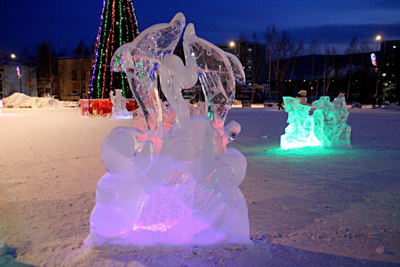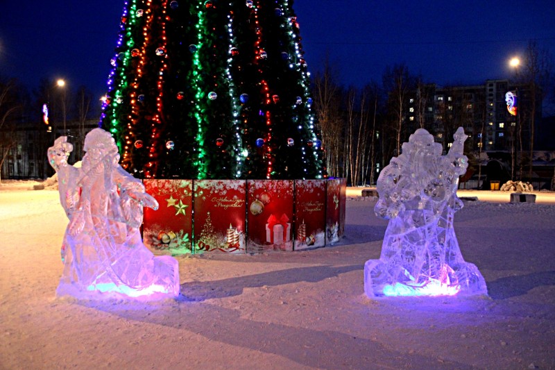 Особое очарование площади придают изящные ледяные фигуры, над созданием которых с мастерством и вдохновением трудились талантливые мастера из соседнего северного города Нерюнгри. Их искусные руки превратили обычный лед в настоящие произведения искусства, которые радуют глаз и дарят ощущение чуда.