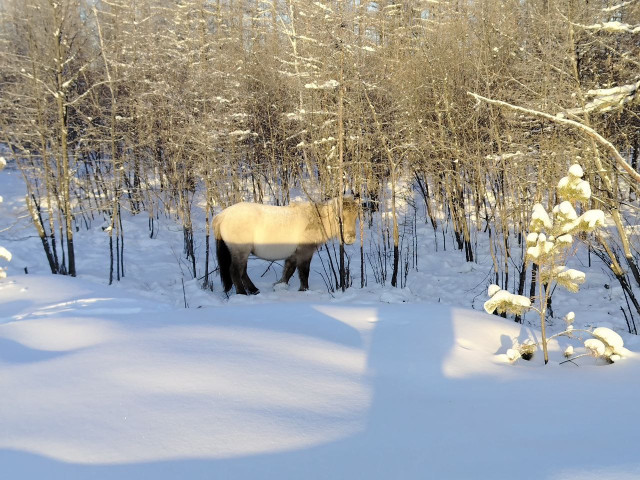 На его открытке изображены лошадь и елочка. Причем лошадь — не просто как символ наступающего года, а как символ доброты и теплоты людей, живущих в северной Усть-Уркиме. Ведь в этом эвенкийском селе обитает целый табун самых морозостойких лошадей, которые самостоятельно кормятся и которых сельчане иногда подкармливают.