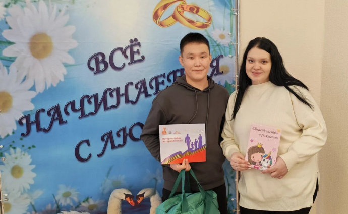 В канун Дня Защитника Отечества в отделе ЗАГС г. Тынды, молодые родители получили первый документ своей дочери, подарок Губернатора Амурской области «Рожденному в Приамурье» и особый презент — книгу «История любви — история Победы».