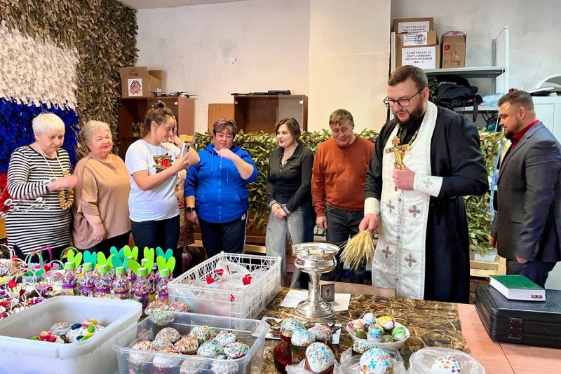 Сегодня настоятель Кафедрального Собора «Святой Живоначальной Троицы», Иеромонах Власий, освятил пасхальные куличи и яйца, изготовленные руками волонтеров центра гуманитарной помощи «ZacVоих».