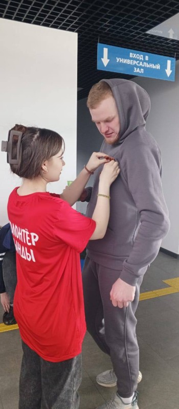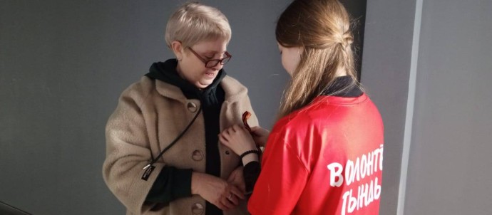 Волонтеры муниципального штаба осуществляют раздачу Георгиевских лент.