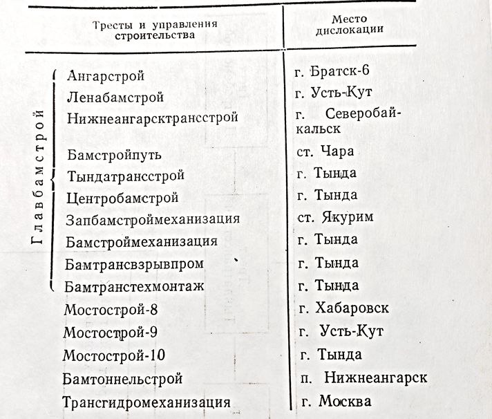 В состав ГлавБАМстроя входили различные тресты и управления строительства.
