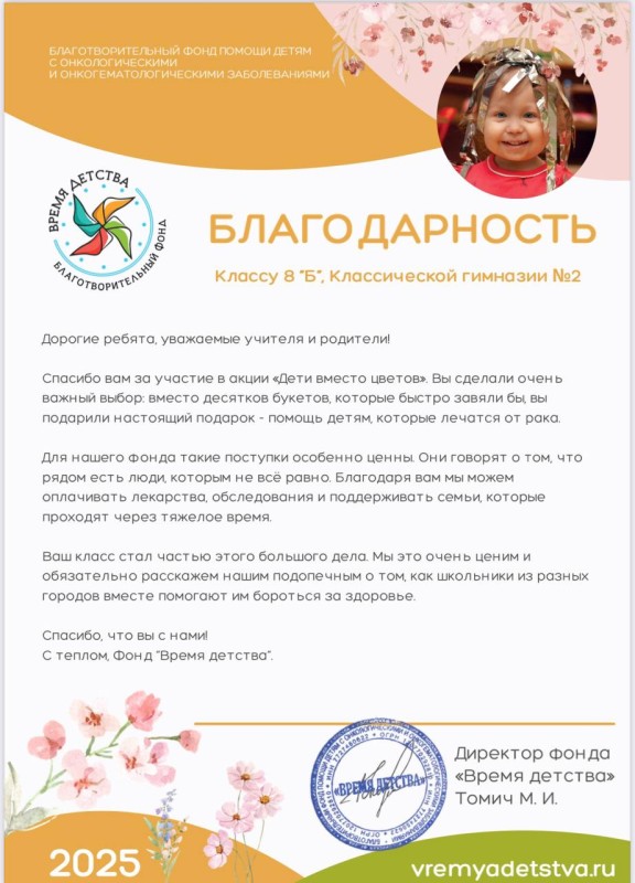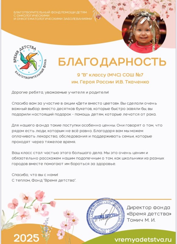 В День знаний ученики 8 «Б» класса гимназии #2 и 9 «В» класса школы #7 имени Героя России Игоря Ткаченко (https://t.me/vremya_darit_radist/608) в школу пришли не с пышными букетами, а с символикой фонда «Время детства» на груди. Родители откликнулись на акцию фонда, классные руководители такое решение поддержали.