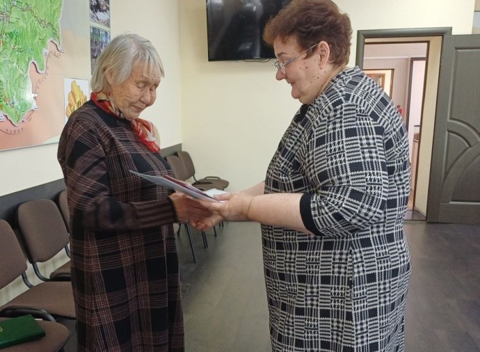 Глава Тындинского округа Тамара Александровна Лысакова вручила награду Галине Андреевне Абрамовой, которая являлась опекуном Григория Владиславовича до наступления им совершеннолетия.