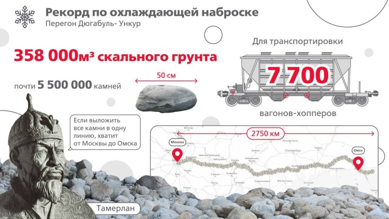 Больше всего «охлаждайки» наши строители отсыпали на перегоне Дюгабуль – Ункур в Амурской области. Объем термозавесы здесь составил 358 000 кубометров, это почти 5 500 000 полуметровых булыжников!