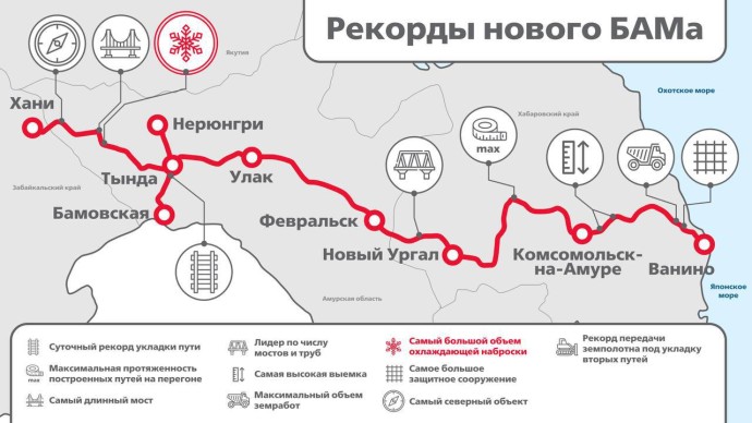Ранее в рубрике #РекордыНовогоБАМа мы рассказывали, на каком из перегонов «сплели» металлическую сеть, (https://t.me/NashaKoleya/3223) которая в четыре слоя покроет Красную площадь, и где построили больше всего путей. (https://t.me/NashaKoleya/3204)