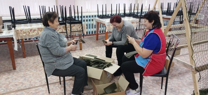 Работа в посёлке не останавливается: волонтёры продолжают плести маскировочные сети для бойцов.
