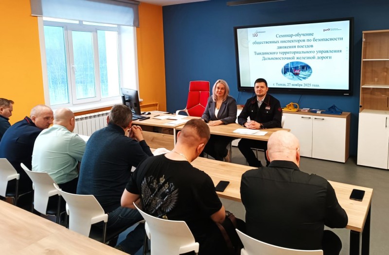 В процессе обучения причастным доведены результаты работы общественных инспекторов по безопасности движения поездов в 2025 году, состояние безопасности движения поездов на Тындинском территориальном управлении, сезонные риски в структурных подразделениях и задачи в области культуры безопасности.