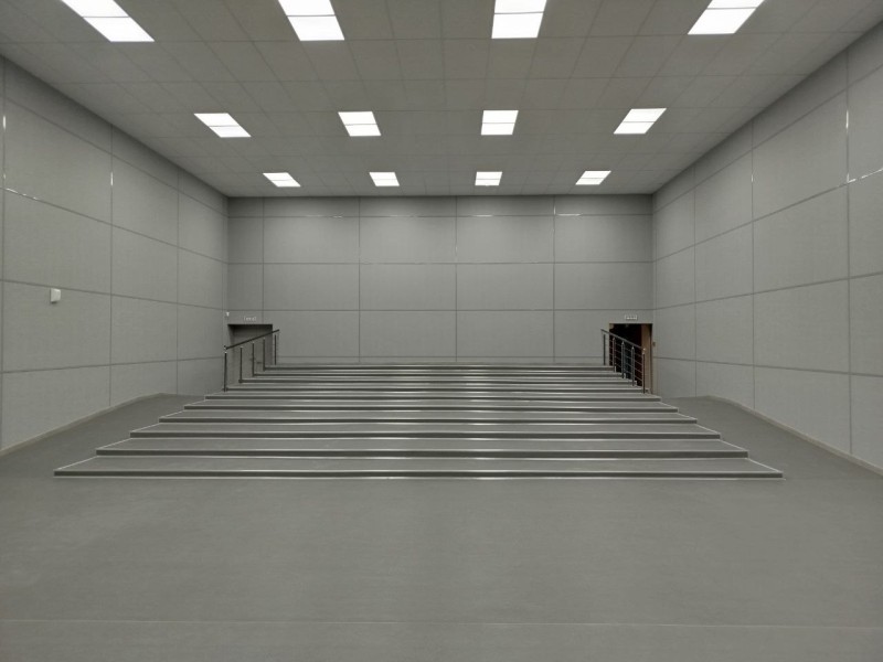 Теперь помещение полностью обновилось и преобразилось. Заменили полы, отремонтировали стены и сцену. Также отремонтировали систему отопления, заменили электрооборудование и электропроводку. Новый потолок с современным освещением добавил залу яркости, а стены теперь выглядят стильно благодаря декоративным панелям.