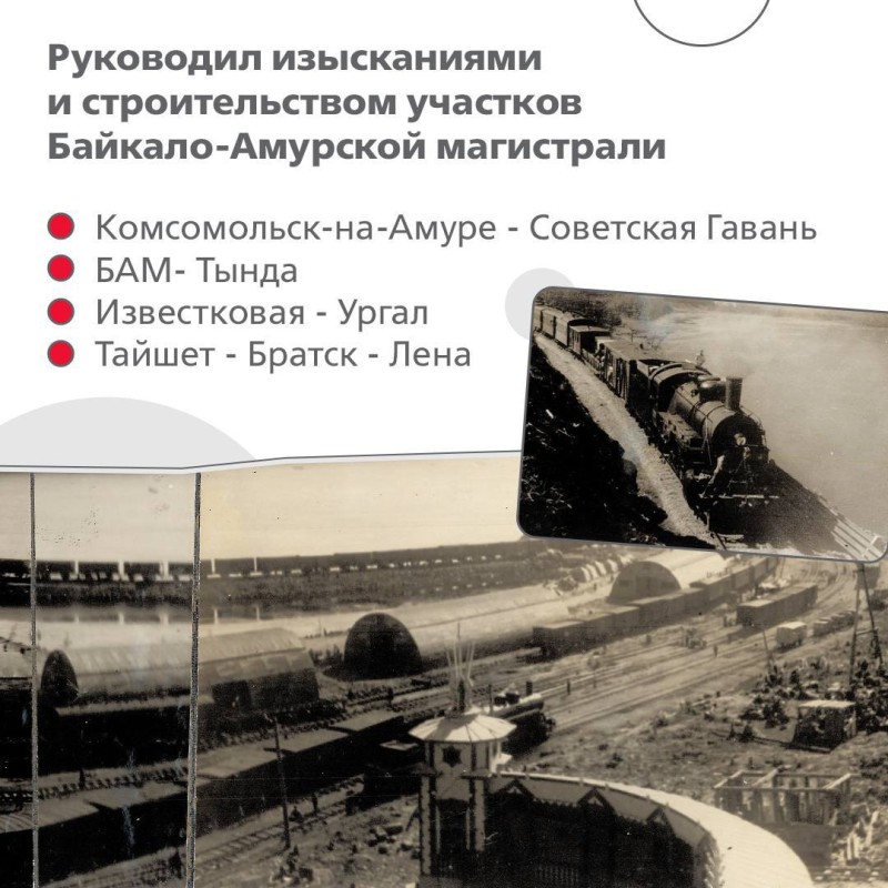 В честь выдающегося инженера назван разъезд на 3118 км БАМа, который построили компании Нацпроектстроя.