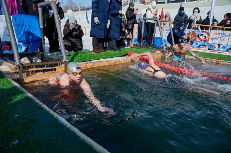 В этом году у пловцов – дебют. Они выступали на новом месте. Погода внесла свои коррективы – например, для того чтобы не допустить образование льда, организаторы подогревали воду.