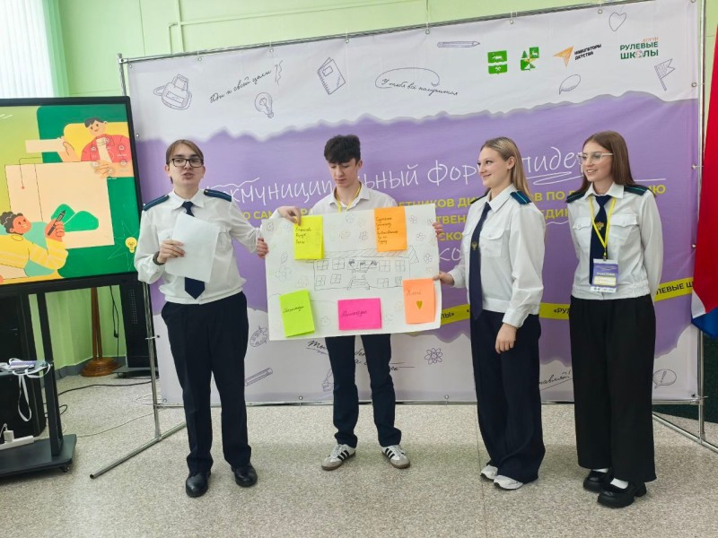 Советники директоров по воспитанию и Председатель межмуниципального Совета обучающихся (Вечтомова Ольга Османова Раксана Пестрякова Валентина, Иванюк Николай) презентовали свои практики в формате «Печа-куча» на площадке по обмену опытом.