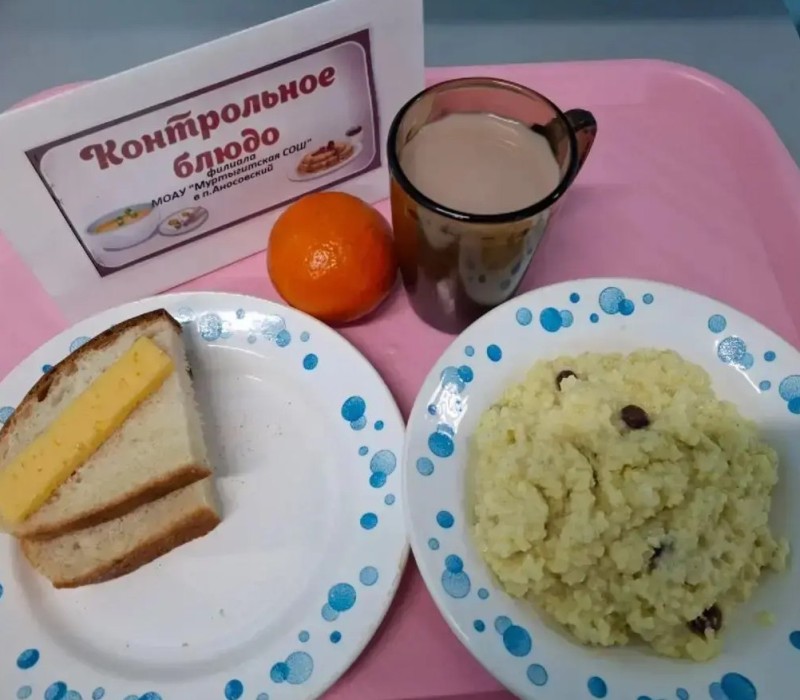 В Аносовском: пшенная каша с изюмом, батон с сыром, мандарин и какао.